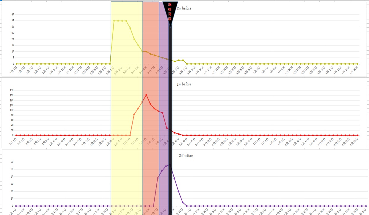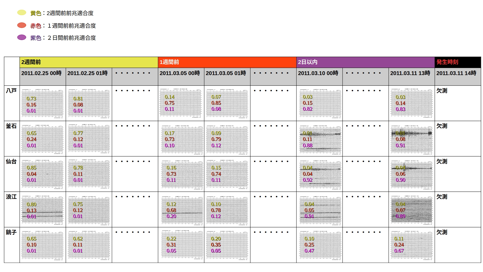| ↓震源域 \ 発震までの期間→ | 2週間以内 | 1週間以内 | 2日以内 | 該当期間外 |
